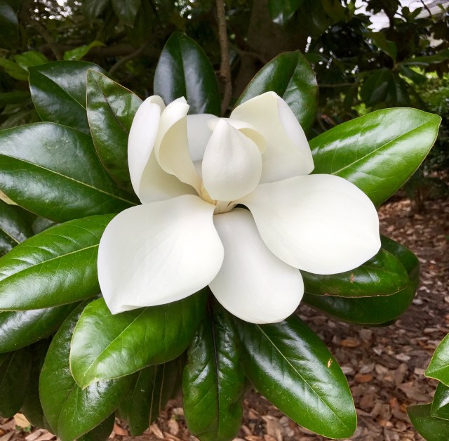 A lovely magnolia blooming so close to our driveway that I can lean my head through my open car window and stick my nose in it: