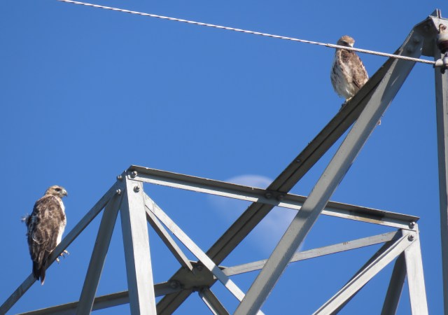 Monday (7/31) (this image is a bit more pedestrian) there was a pair of Red-tails on my “local” powerline – I can walk one house down from my driveway and look right at it. The moon was up and although I couldn’t get the precise image I would have liked, this one came out okay. It called to mind a 1988 song by U2 called Hawkmoon 269: