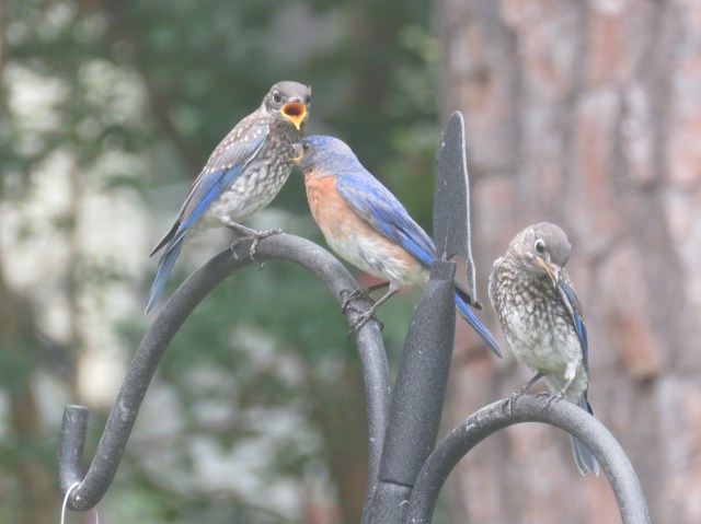 I pivoted from the spot of having lunch on my back porch Thursday (8/3) to take this picture of starving (they would have you believe) baby bluebirds trying to convince their parents that they are unable to feed themselves. Out of the overfull bird feeder they just pooped on about two seconds earlier: