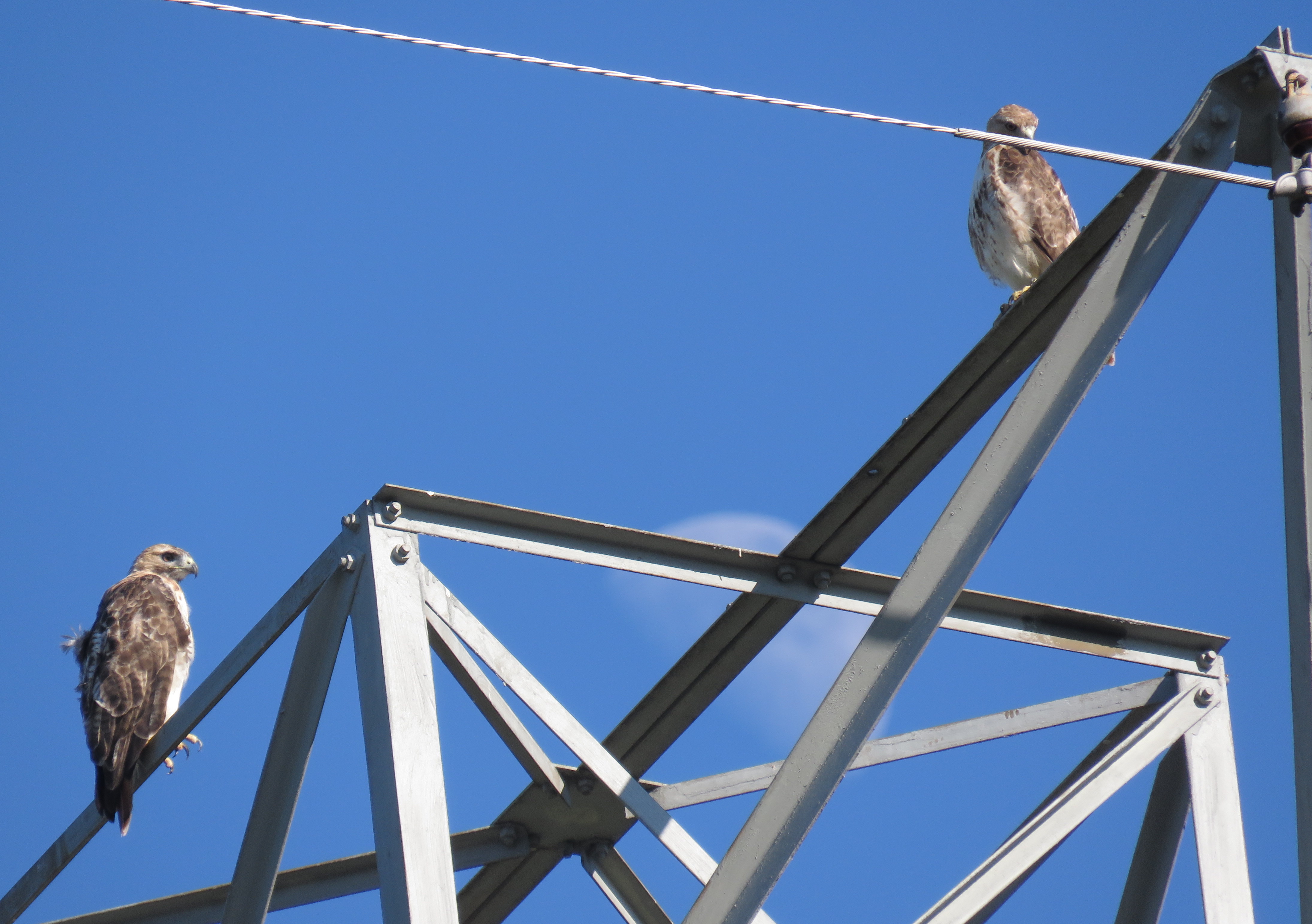 A pair of Red-tailed hawks on the powerline across the street, moon rising behind them