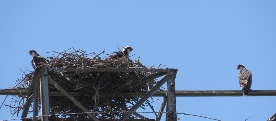 Osprey parent on left and right, adolescent in middle, screaming for fresh fish