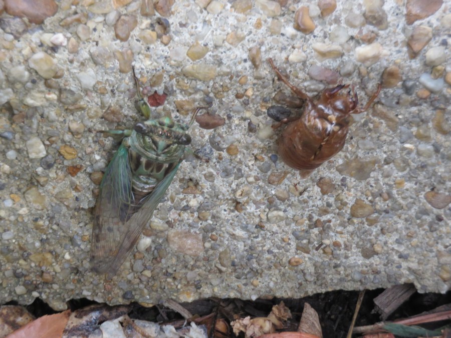 Recently emerged cicada on left. Recently discarded shell on right.