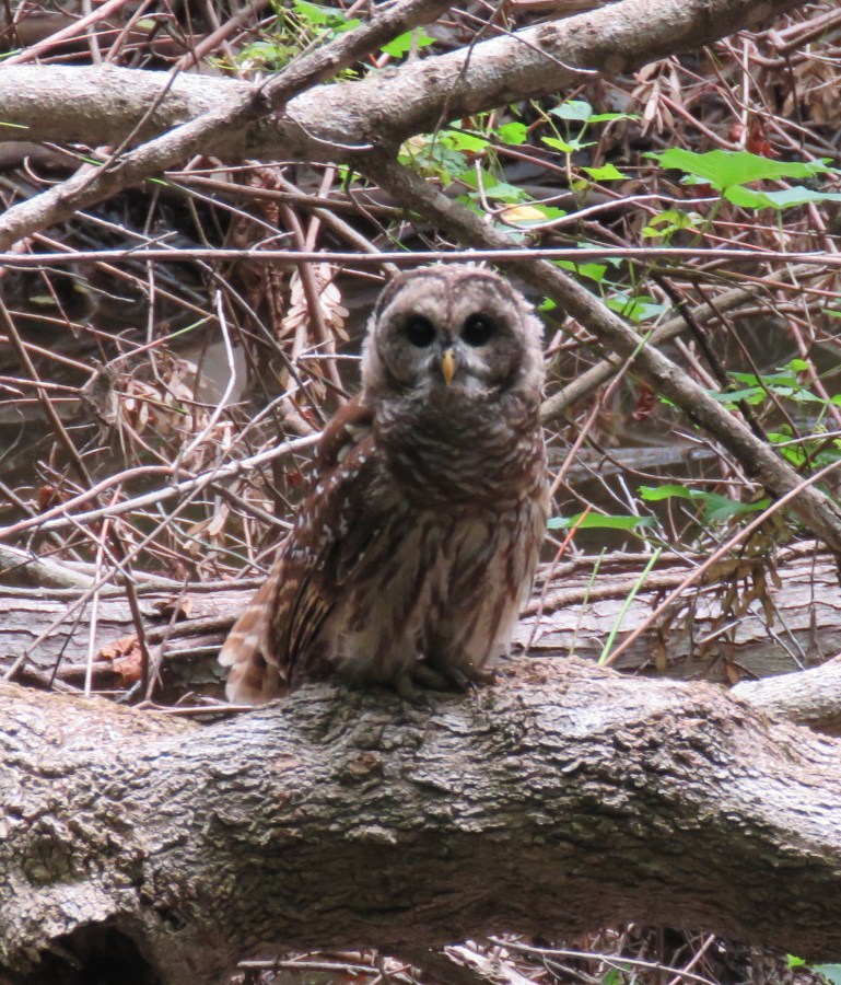 A young Barred owl peers up from the creekbed Thursday morning: