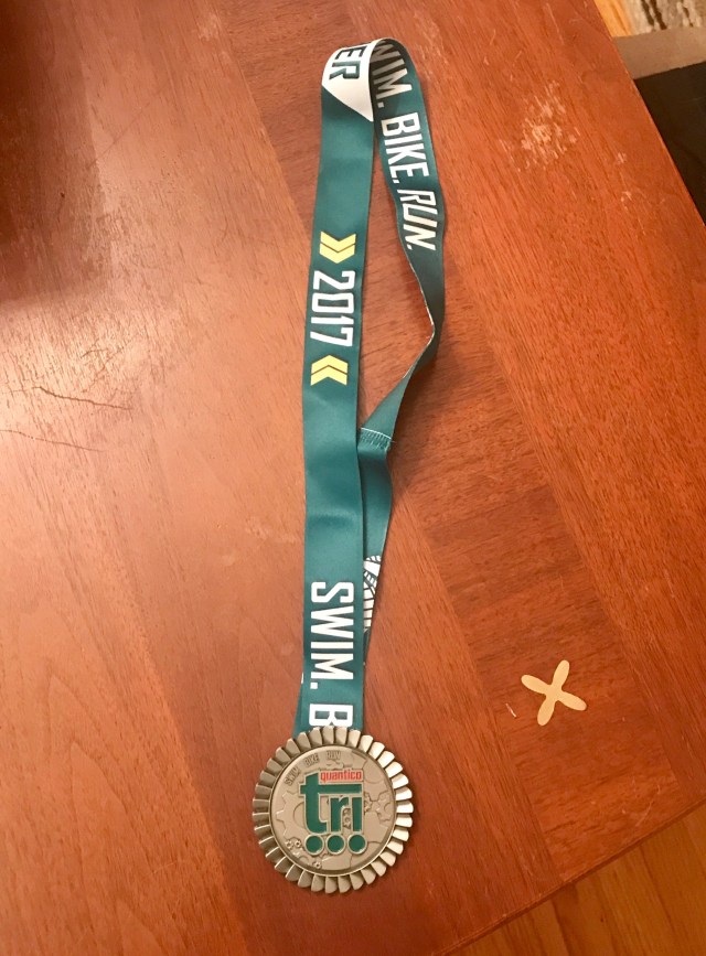 Me on the left, Pat’s brother-in-law Tom next, then Pat, then Andrew, Quantico Triathlon 2017 – photo credit to Pat’s wife (Tom’s sister) Megan. Thanks Megan!