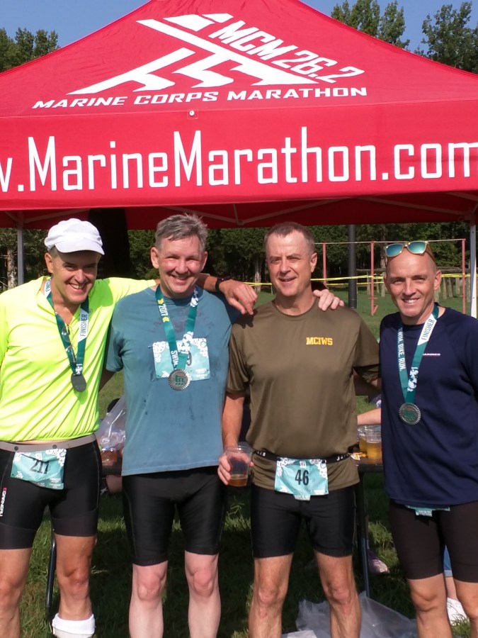 Me on the left, Pat’s brother-in-law Tom next, then Pat, then Andrew, Quantico Triathlon 2017