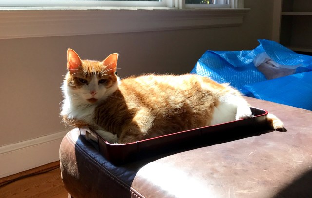 Snap back to civilization – I’ll close with a picture of Dash snoozing in the tea tray in the living room. This is an animal who has zero concept of the word “stress”: