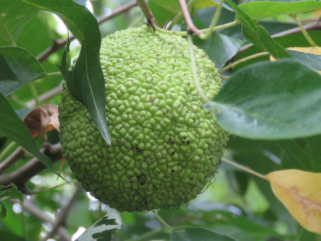 On Wednesday (9/7) near the CSX tracks downtown, I saw my first Osage orange of 2017. I was surprised and gratified to discover it – I wasn’t expecting it until October or November. Next week I’ll use something for scale, because it’s hard to get a feel for how big these are. Not quite as big as a softball but much bigger than a baseball: