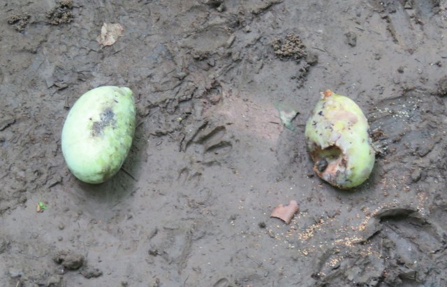 There were still pawpaws at the river this morning – a lot. I’m not sure what eats them besides me. But something must – they are so delicious and there are so many of them. They taste best right there on the river bank. You can smell the river and feel the wind and hear all the riverbank sounds, the crickets, the leaves, the water, the breeze, it is in every way a feast. Here’s a picture I took this morning – with a raccoon footprint in between. Since raccoon feet are referred to as paws, the caption for this was inevitable: