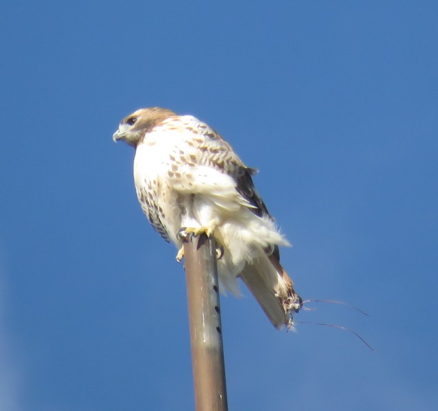 So, anyway, Thursday. Certain predictable red-tails in certain predictable spots help me feel a certain predictable calm, and I make a point to visit them when I’m in the area. My camera is always in my car. The cell phone tower in the Westbury Apothecary parking lot is a reliable spot for Red-tails, and I photographed one on Thursday (9/7) at 5:00 PM. It wasn’t until I looked at this picture on the computer a few hours later that I saw the damage to its tail. I’m not certain what’s happening here – I’m open to suggestions. Note carefully also the two streamers coming off the tail: