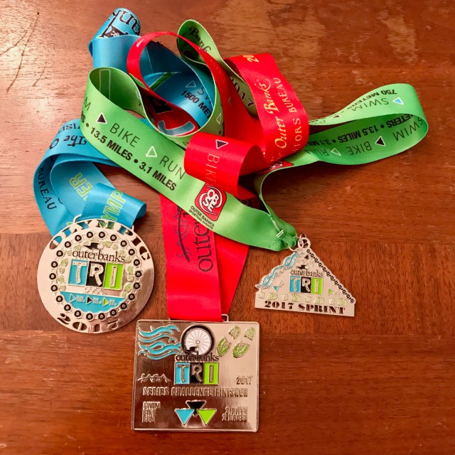 Yesterday’s (Saturday’s) race was an Olympic distance triathlon, consisting of a 0.93 mile (1,500 meter) swim, followed by a 24.8 mile (40 km) bike and finishing with a 6.2 mile (10 km) run. This morning’s race was a Sprint distance triathlon – precisely half as long as yesterday’s race. Today we started out with an 0.5mi (750m) swim, then a 12.4mi (20 km) bike and ended with a 3.1mi (5 km) run. I would say that these medals were the reward for all our hard work – except we didn’t do any!