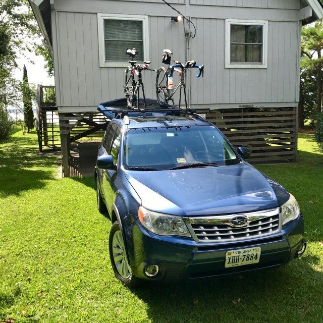 I mean, seriously. We got to swim and bike and run around Manteo and the Outer Banks of North Carolina for a few hours each on two days. We saw beautiful scenery, we met positive, upbeat, cheerful people, and we had others yelling encouraging words at us the entire time. So which part was the hard work? No part, that’s which part. A person in Andrew’s family owns a cottage in Kill Devil Hills, NC, and that’s where we stayed. Here’s my car parked outside: