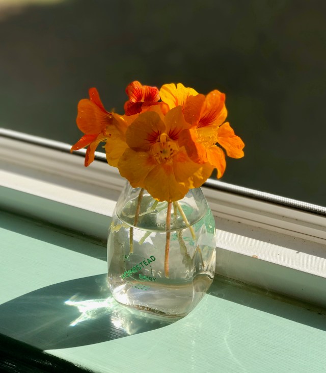 I also can’t let a late summer week go by without a picture of the nasturtiums Ev still has proliferating in our front yard; she brought these in a couple of days ago: