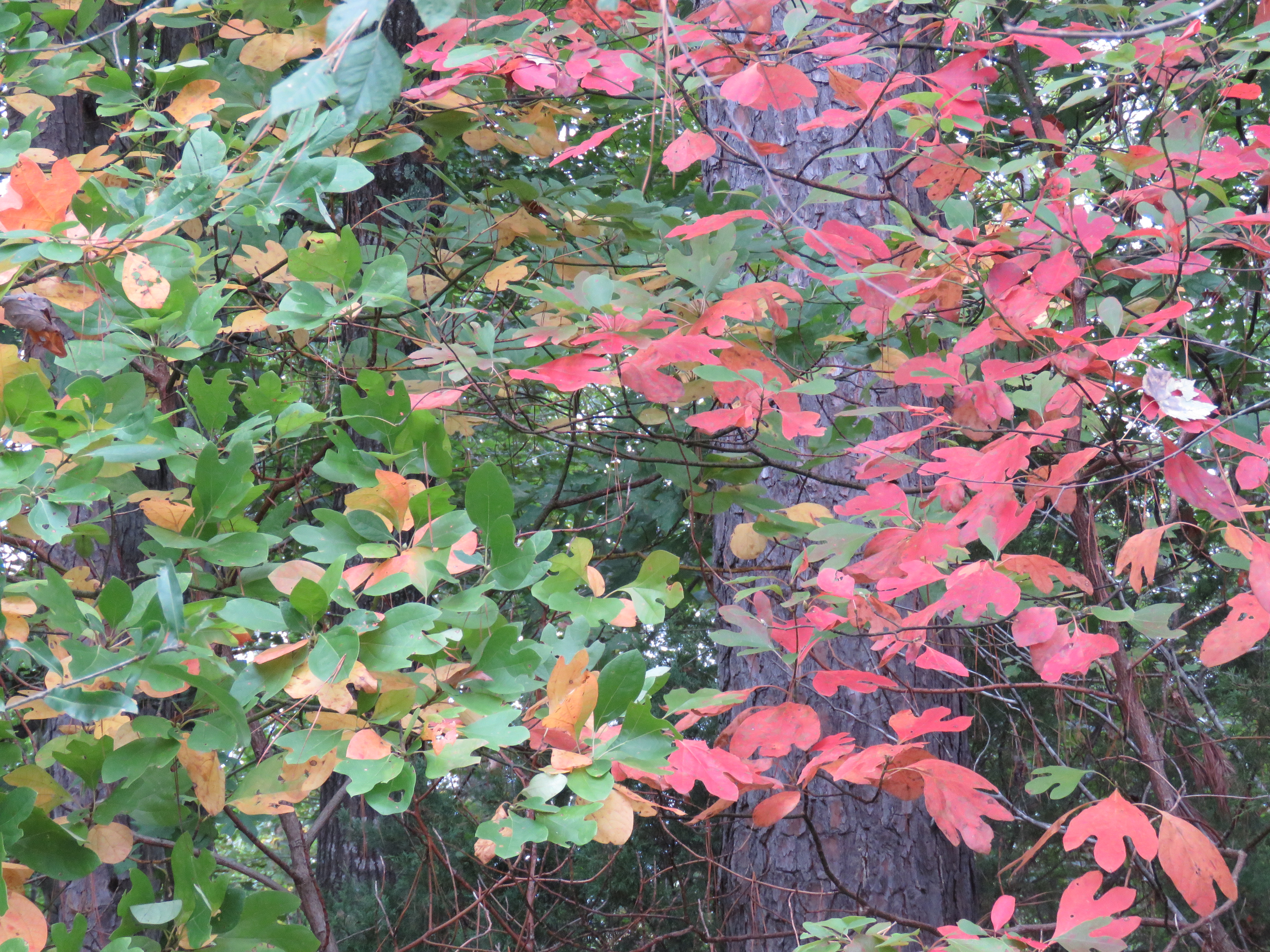 Mostly green sassafras on the left, mostly red sassafras on the right