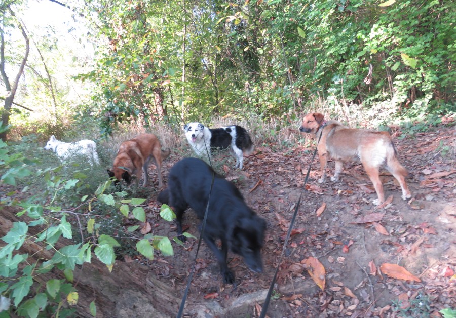 Yuki white on the left, Lola brown on the right, Mackey black in the foreground, Turner brown on the left, Luna black and white