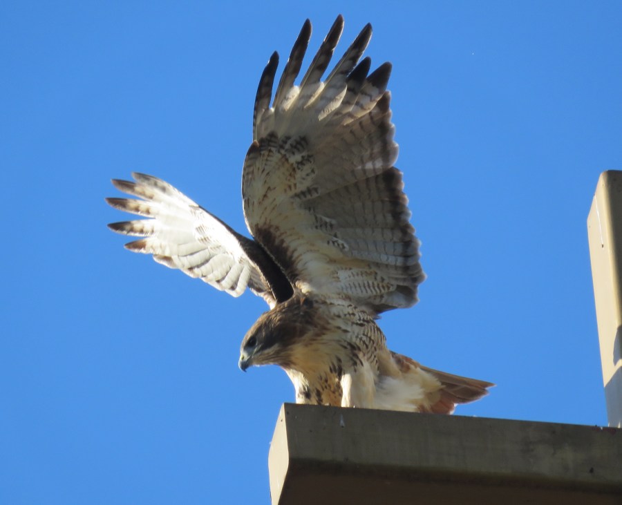 Red-tailed hawk stretching its wings on the cross on top of Discovery United Methodist Church