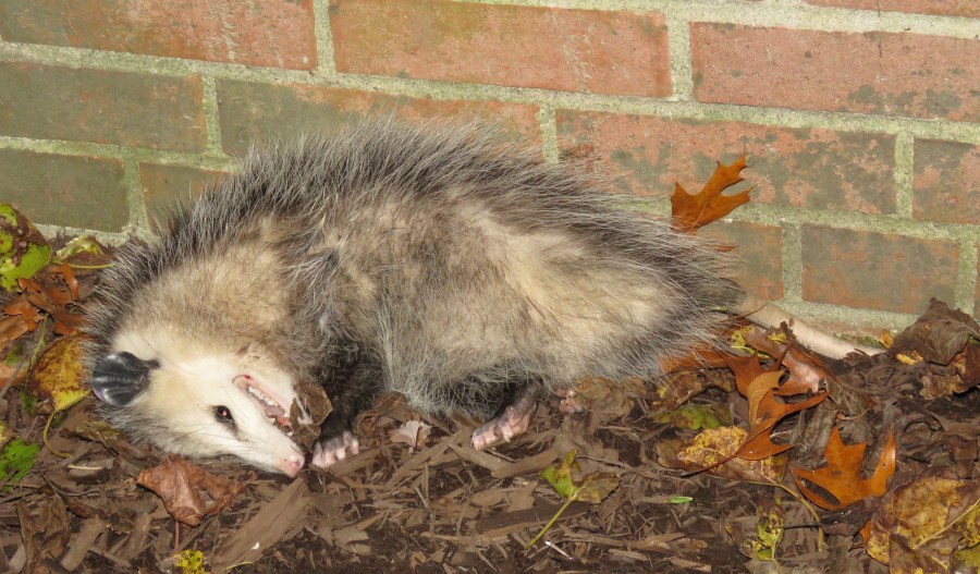 A healthy, fully alive, untouched opossum, busted stealing (or cleaning up) bird seed, now “playing possum”