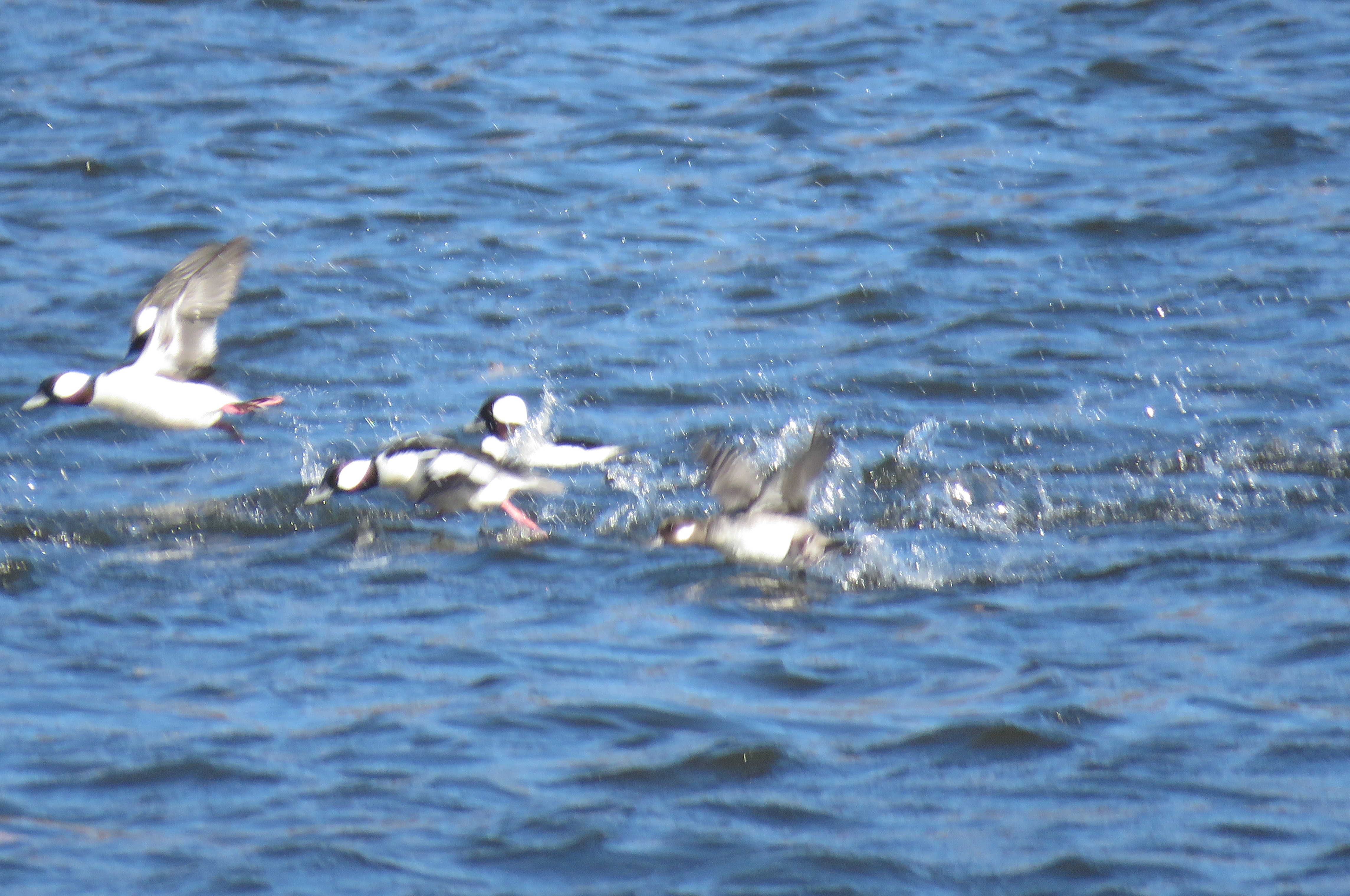 Buffleheads splash-flying upstream this morning