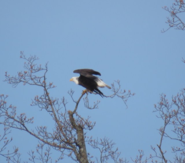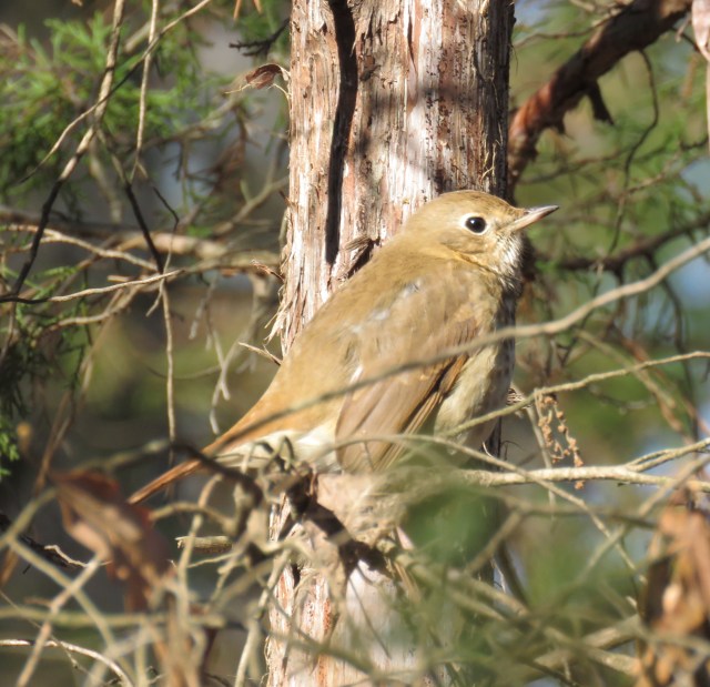 I got another Red-tail the same day, but it was a dull picture. I caught a Hermit Thrush (Catharus guttatus) pausing momentarily in a trailside tree at Deep Run Park Friday. This is also a bird I don’t see every day: