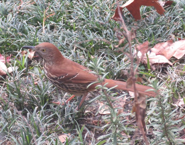 I took that picture of the two Towhees at around 3:30 Wednesday afternoon. I’ve noticed going through my pictures from that day I photographed a Brown Thrasher (Toxostoma rufum) in nearly the same spot around 11:30 that morning. I guess these secretive birds are more visible with less cover (leaves) to hide in. Plus calories are getting scarce and they’re grateful – in their avian way – for reliable food: