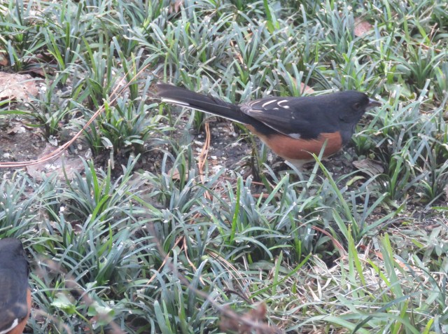 I apologize (yet again) for the quality of the next image, but it was such a great “catch” (though imperfect) I had to include it anyway. It’s quite difficult (for me) to photograph and often to even see Eastern Towhees (Pipilo erythrophthalmus). Wednesday afternoon I looked out my window and there were two on the ground! I got one click before one disappeared. There’s an obvious bird in the center and another one lower left. Maybe I’ll do better soon: