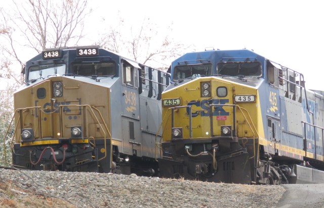 PS Almost forgot – went to Tredegar Iron Works with another train loving buddy on Wednesday around lunch and got a rare (for me) “double” on CSX freight trains. The train on the left was all coal; that lead locomotive (#3438) is a GE AT44AH (4,400 HP). The train on the right was covered hoppers, so probably corn or grain or something like that. Locomotive #435 was a GE AC4400, also 4,400 HP):