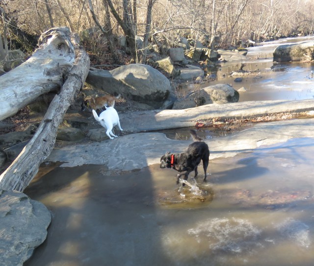 I’ll close with an imprecise picture of Mackey and Yuki at the river this morning. Turner doesn’t mind the cold even a little bit, but he is steadfastly unfond of any water for any use that is not related to drinking. It was, as noted earlier, 25º degrees, and Mackey had just cracked through about a quarter-inch of ice. The water was only four inches deep so all that happened was wet feet. I watched him closely for signs of distress, but in less than a minute he was sprinting down the edge of the river behind Yuki, bounding falling logs and tearing through the undergrowth. He couldn’t have cared less. I think it made him run faster.