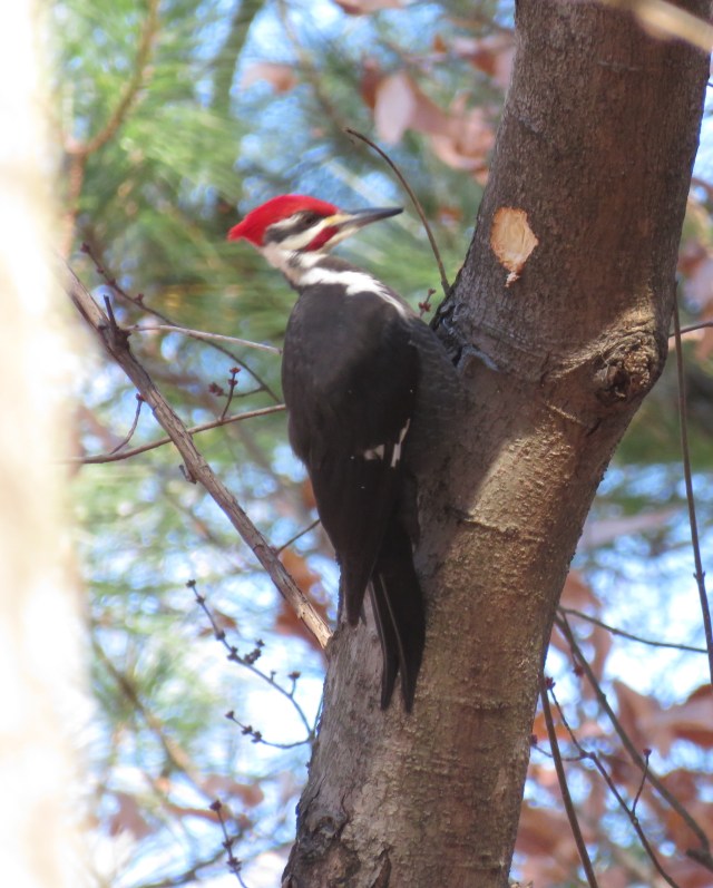 I don’t have a ton of great content for this post (title is Exhibit A) but I spotted a Pileated Woodpecker in decent light this morning at Pony Pasture. I didn’t get the picture I’d hoped (I almost never do) but this isn’t awful. It’s a bit difficult to tell (the image is regrettably not crisp) but you can tell this is a male since he has a red stripe just behind his beak. Females look just like this except no red streak. Both genders have that remarkable red crest: