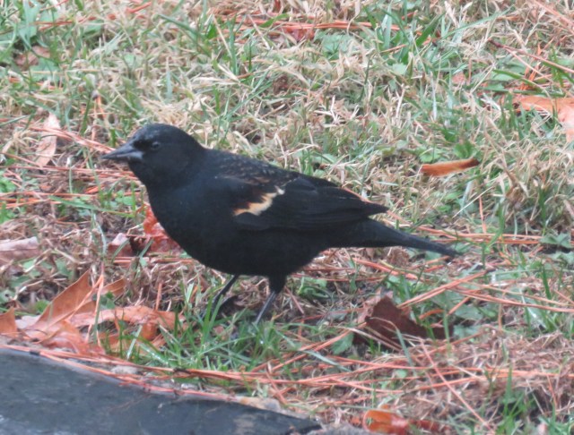 Shortly after lunch today I was pointing my camera out the window at a robin when it abruptly leaped off the ground and headed for a more comfortable spot. I was surprised to see it was displaced by this Red-winged blackbird:
