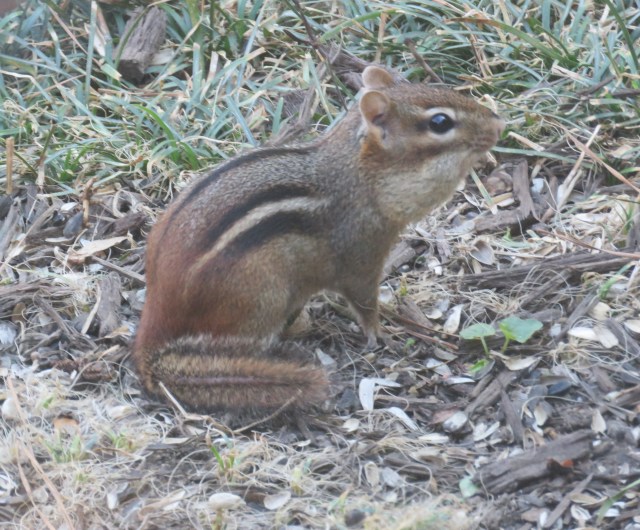 These guys (and girls) are favorites of hawks too, and they don’t put up as much of a fight. It’s an Eastern Chipmunk. Notice its puffed up cheeks? One of their survival strategies is to fill their cheeks with food then go underground to eat it. Spend less time attracting the attention of hungry predators. They love fallen bird seed: