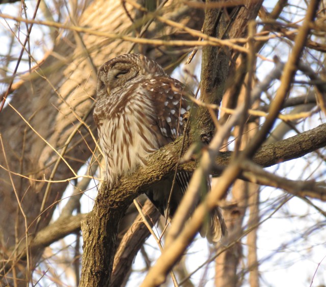 I’ve been working on a-raptor-a-week this whole year – today is the end of the tenth week – and been successful each week. I’ve gotten a couple of cool images, including a Bald Eagle on January 1, a couple of accipiters, and a couple of Red-tails holding fresh caught squirrels. But nothing to write home about. Then Monday afternoon Sam and I were hiking at Pony Pasture and we heard the familiar sounds of a Barred Owl near where the pipe crosses the creek. If you’ve never heard one, check it out here: Barred Owl sounds. If you hear something that sounds owl-like at Pony Pasture, it’s generally a Barred owl.