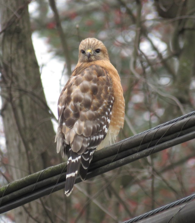 After our hike we dropped Yuki off at Ariel’s house. Then Mackey and Turner and I took Lola and Luna to their house and dropped them off. So we’re driving home – we have less than two miles to go – we pass the Tuckahoe Shopping Center and then Tuckahoe Elementary School and I see a Red-shouldered Hawk perched on a wire next to the road. Red-shoulders sit and wait for a long time, so I came back and parked and got out and took this shot: