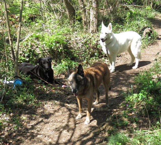Just FYI, the deer are walking nonchalantly toward all four of us. Mackey is lying down on the left, Turner in the middle, Yuki in the rear. They’re all on leashes. I guess the deer know it: