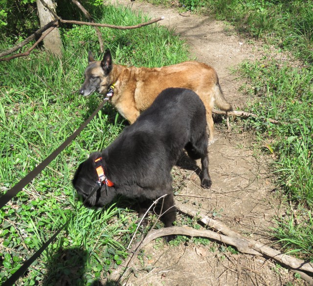 If you’re hiking with dogs, it’s easy to see deer. Just trust that’s what your dog’s gaze is riveted on. I’m standing behind Yuki in this picture, looking where he’s looking. Just trust they’re in this picture, and look closely. Draw an imaginary line vertically from each of Yuki’s ears. See the two deer? There’s one on each side at the top of the image, indistinct in the shadows. They’re masters of disguise!: