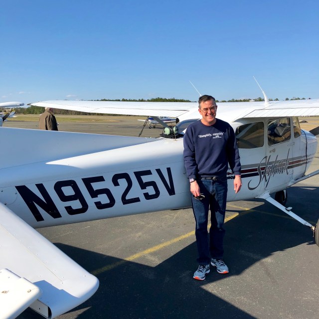 I spoke with many friends who urged me to take up flying again, even though I can’t get a license. On 5 April, 1988 I went “flying over the hood of a car” when I was hit while riding my bicycle. Thirty years later – to the day – I began flying lessons again at Hanover County Airport- KOFP- Richmond Virginia (Ashland). So, on 5 April, 2018 I “flew over the hood of a car” (several) again, but this time it was by choice – and I was about 2,000 feet over the hoods. If you want to fly over the hoods of cars, I heartily endorse the 2018 version. Vastly superior. My instructor, John Doyon, took that picture just after we landed. Thank you for the excellent lesson and for taking the picture!