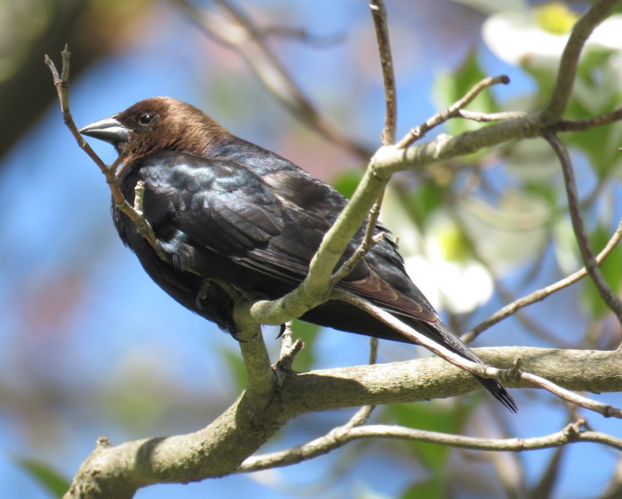 Brown-headed cowbird perched in that spectacular dogwood