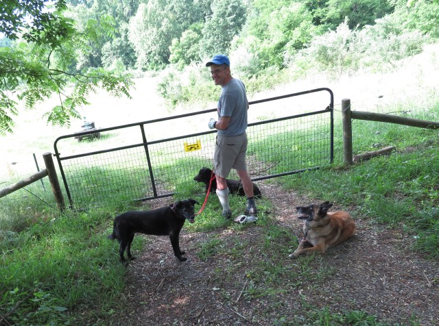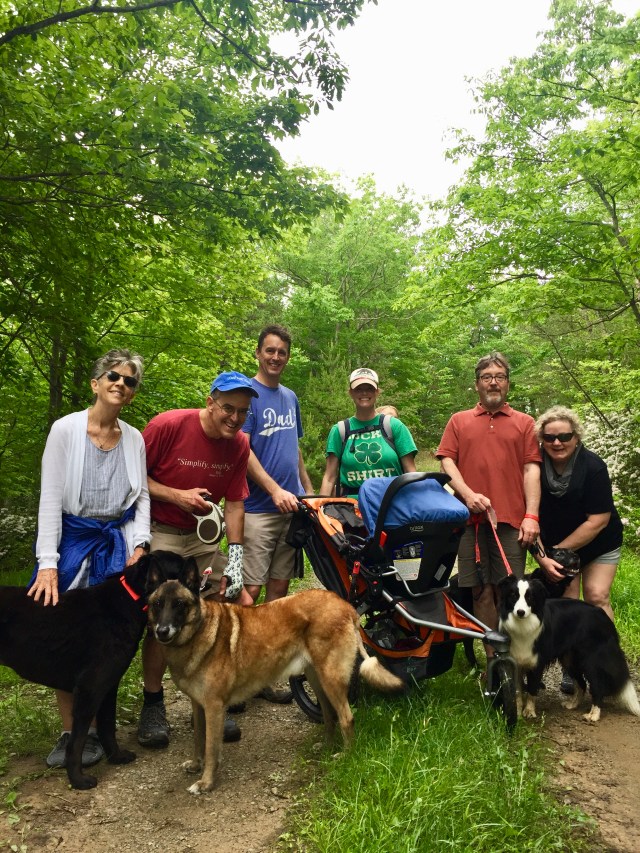 Evelyn and Mackey and Turner and I drove to Blacksburg yesterday and spent the night with my brother Shane and his wonderful family. And visited with friends! Not long after we arrived we went hiking! With dogs! Here’s the whole crew. There is one very small head just visible on his mom’s back in the center picture and his brand new sister is invisible (from this angle) in the stroller in the center. Family, friends, dogs and hiking – I hope your weekend was this much fun. Kristin, thanks for making this image happen: