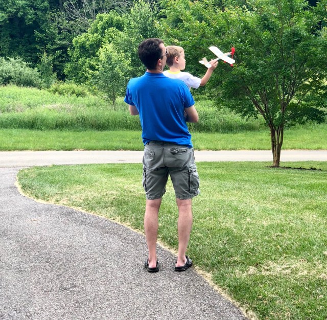 The small head on his mom’s back in the preceding picture? Here is him today with his dad flying a Guillow Jetstream balsa airplane: