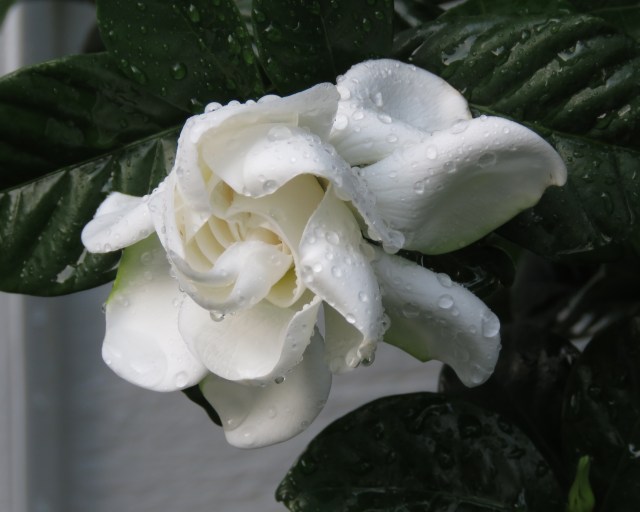 It’s the rain. Richmond’s CBS affiliate WTVR Channel 6 television said “May 2018 set new weather records” and “Richmond International Airport received 10.35″ of rainfall, making it the wettest May in Richmond weather history, which goes back to 1872.” There are birds and flowers and lush growth everywhere I look. As I type these words (Sunday evening) it’s pouring again. Here’s a gardenia Ev’s growing in the backyard. I took this picture at 7:45 this morning (it rained more than an inch last night). Talk about “largesse”: