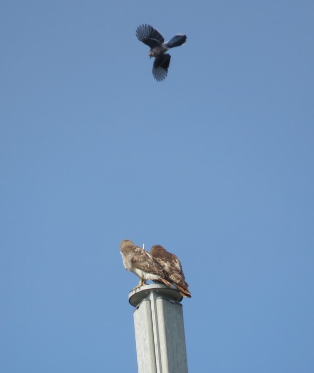 Friday was an absolute binge day for raptors. The opening picture on this post wasn’t the only one I took of that pair. Here’s a bluejay buzzing them (at a respectful distance):