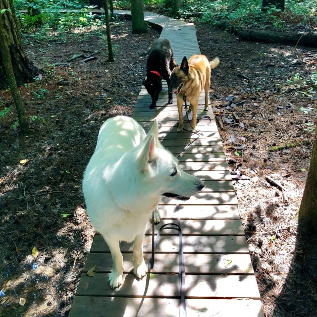 Speaking of largesse from the rain, whatever eats mosquitoes must be fat and happy. We could barely stop on the path at the river (in certain spots) this morning. But I snapped a quick image of the boys:
