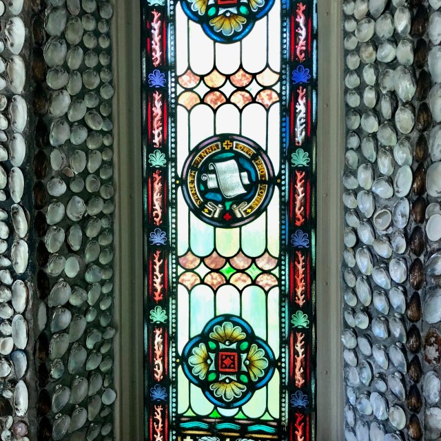 I took this picture a moment before, looking out of a stained glass window in the Shell Chapel. See the shells set in the walls to the right and left of the stained glass window?: