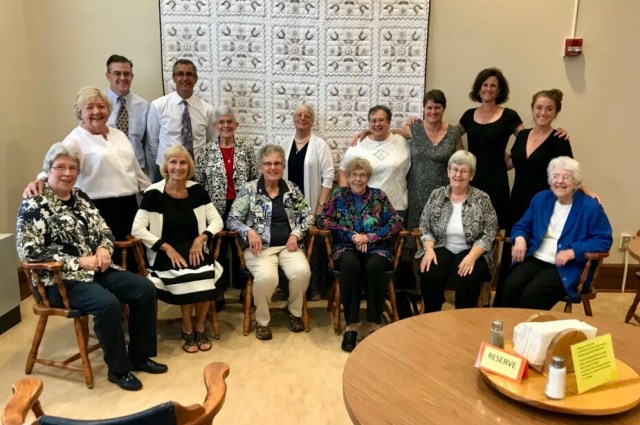 There was a group of her fellow nuns and friends at The Woods when we were there this week – they were her “Band.” This picture is her Band, with Kevin and me behind them on the left and my sisters Katie and Sheila and Katie’s daughter Cappy on the right. That was the most cheerful group of people I’d been around in a long, long time: