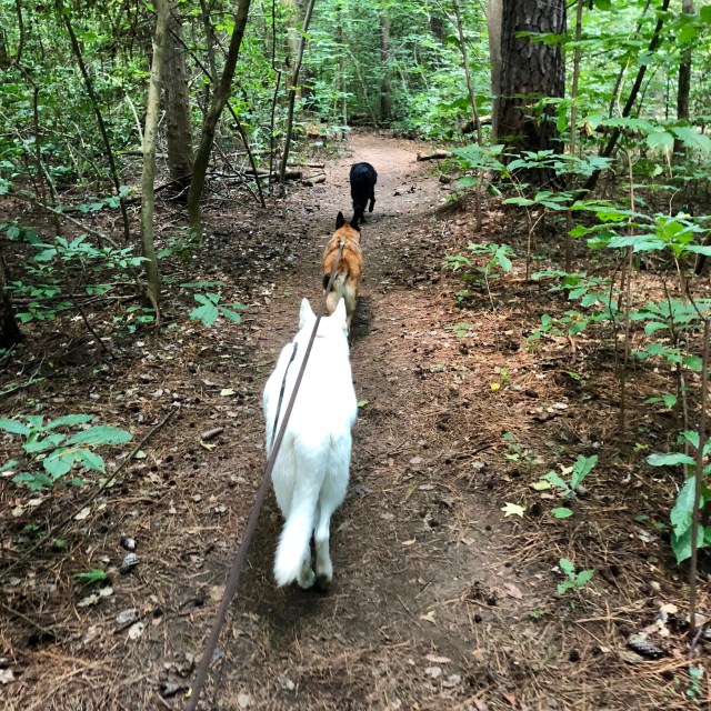 Anyway. I’m thinking too much. Mackey and Turner and Yuki and I had a relaxing hike at the river this morning. This is Mackey leading us back. Turner followed Mackey, Yuki followed Turner, I followed Yuki, all four of us made it back: