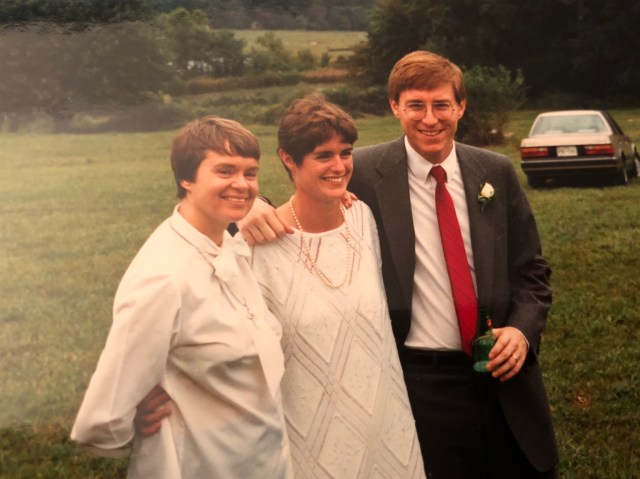 Here’s a picture of Janet about 25 years later at my sister Katie’s wedding. That’s Janet (Sister Pauline) on the left, my sister Katie in the middle and her husband Jim on the right. They were married (or possibly had the reception; I don’t recall) at Camp Waredaca in Laytonsville, MD. Where all five of us were campers and counselors while we were growing up.
