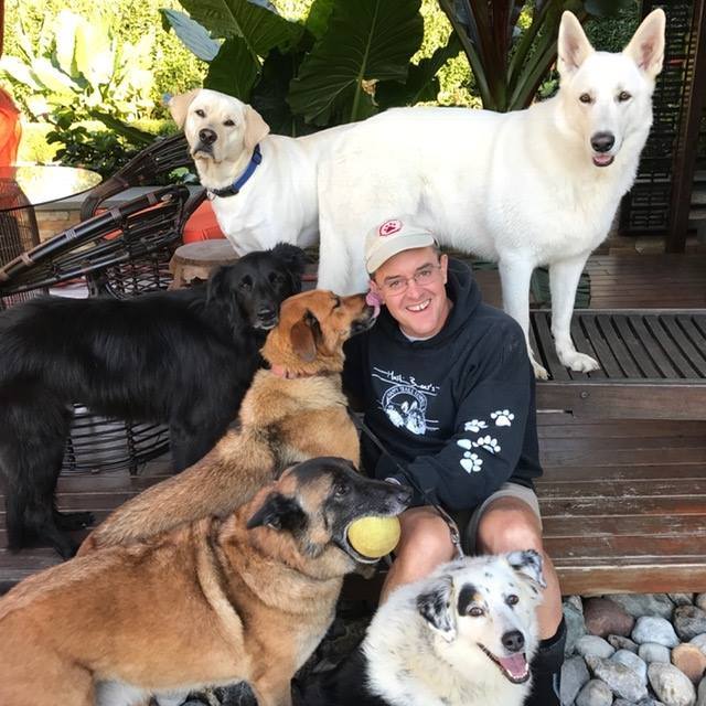 Only two of those live at my house – Turner with the ball in his mouth (he always “has a ball,” both literally and figuratively) and Mackey, solid black, you can barely see him there left center in the image. But Yuki (the big handsome white dog) is a regular hiking buddy of ours. And Luna (bottom, black and white, smiling) and Lola (licking my ear) are also regular companions, and Sonny (top left, yellow Lab, looking soulful) hangs out at Yuki’s house regularly. They’re neighbors.