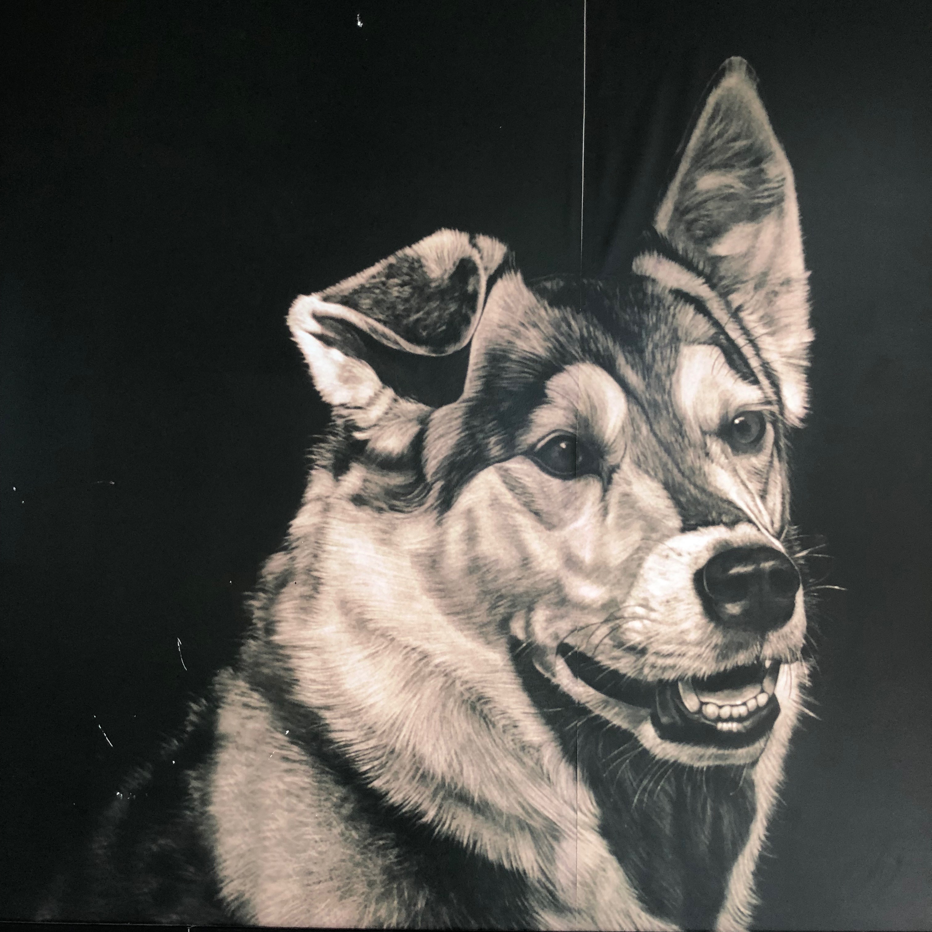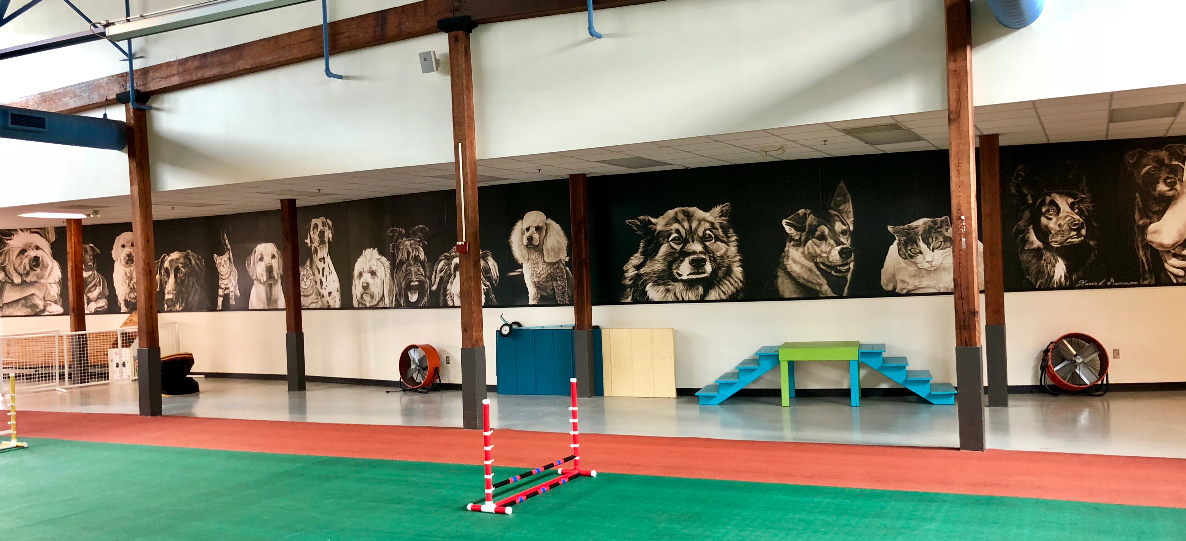But Evelyn and I were near The Diamond Thursday shopping for floor tile. I saw the Richmond SPCA a few doors away. A talented woman named Karen Gammon’s artwork decorates their training a rea. And she did portraits of my first two dogs! And they’re both on the wall!