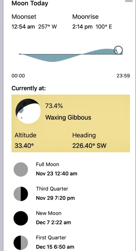 I got a pair of pictures of the moon yesterday. Here it is at 3:40 PM, with information from an app called “World Clock”: