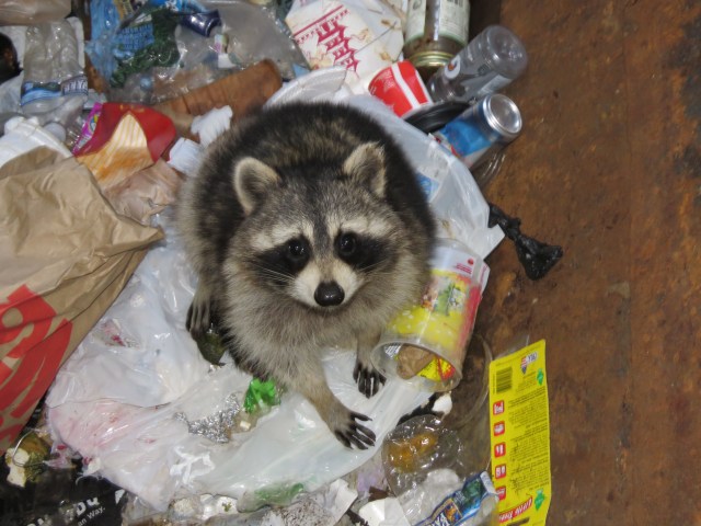 Obviously the background is not something you’ll see in a nature documentary, but we see them where we see them. I took a 27 second video of it munching away on its Thanksgiving dinner down there. It’s not an attractive background, but you get a good view of what it looks like when a raccoon is eating. He’s drinking the last drops of a venti no whip pumpkin spice three pump latte. I’m kidding. It’s some sort of plastic bottle with who knows what inside. But the raccoon is industrious about getting it out. I have no idea what this animal’s gender is: