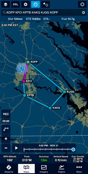 Meanwhile – if anyone is interested – I use a program called ForeFlight to plan my flights. It’s remarkable – it accounts for everything. Altitude, speed, direction, weather, fuel, wind, runways, it is mind-bogglingly comprehensive. Tuesday we had planned to fly to four new airports to get my Aviation Ambassador passport stamped. We’ll do it another time. But this is the course I’d set up: