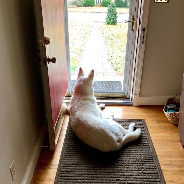 Yuki did come over later today – after Mackey and Turner got home from the river. I think he was hoping they’d play but they fell asleep in front of the fire. I almost did too! Yuki’s a shepherd; they keep an eye on things. Thank goodness our front door is red – a little color!: